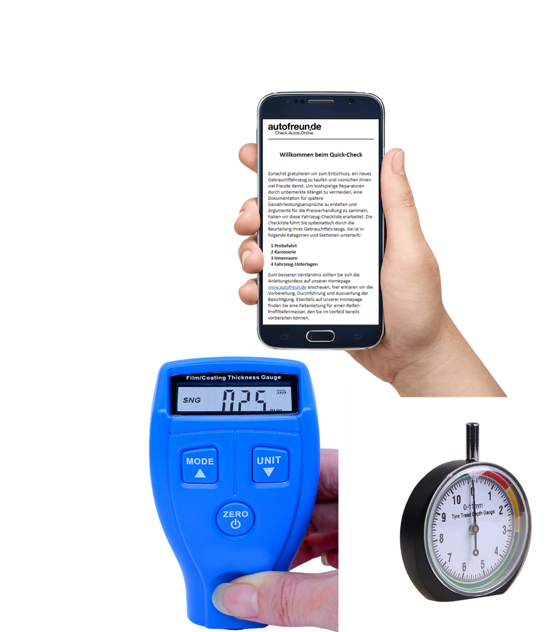 Sie erhalten den Quick-Check für die Fahrzeugaufnahme und -beurteilung, den Lackdickenprüfer GM 200 sowie einen Profiltiefenmesser mit Zeiger.